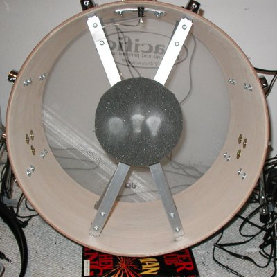 The kick without the sound control system for the real head. The supports mount to the lug screws. Notice the mesh head on the back of the kick.